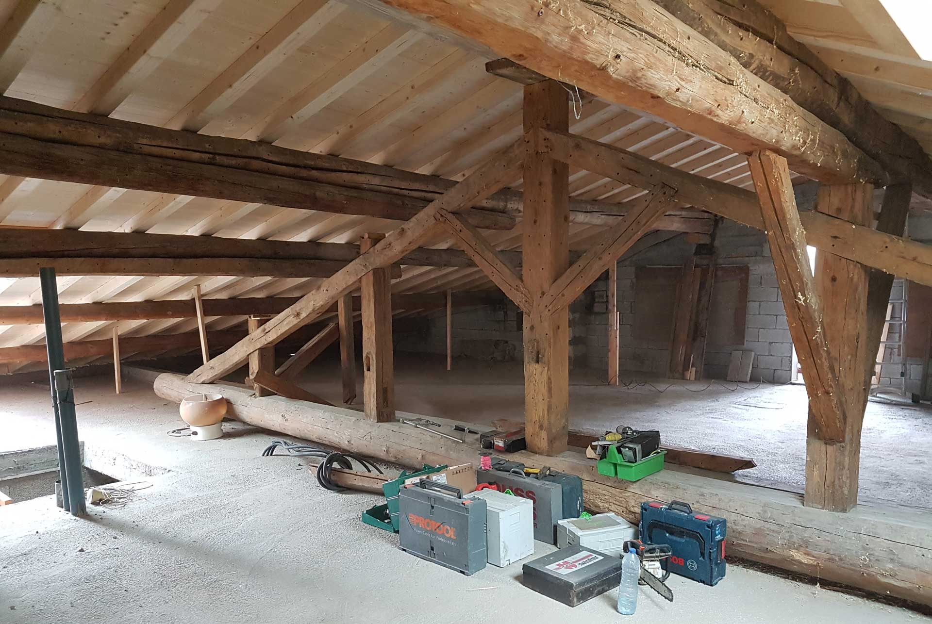 - Taille du bois de charpente dans notre atelier de Bourg-Saint-Maurice.